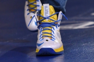 体育资讯4月10日讯 勇士主场迎战湖人,库里今天穿着詹姆斯经典战靴LeBron 10入场。